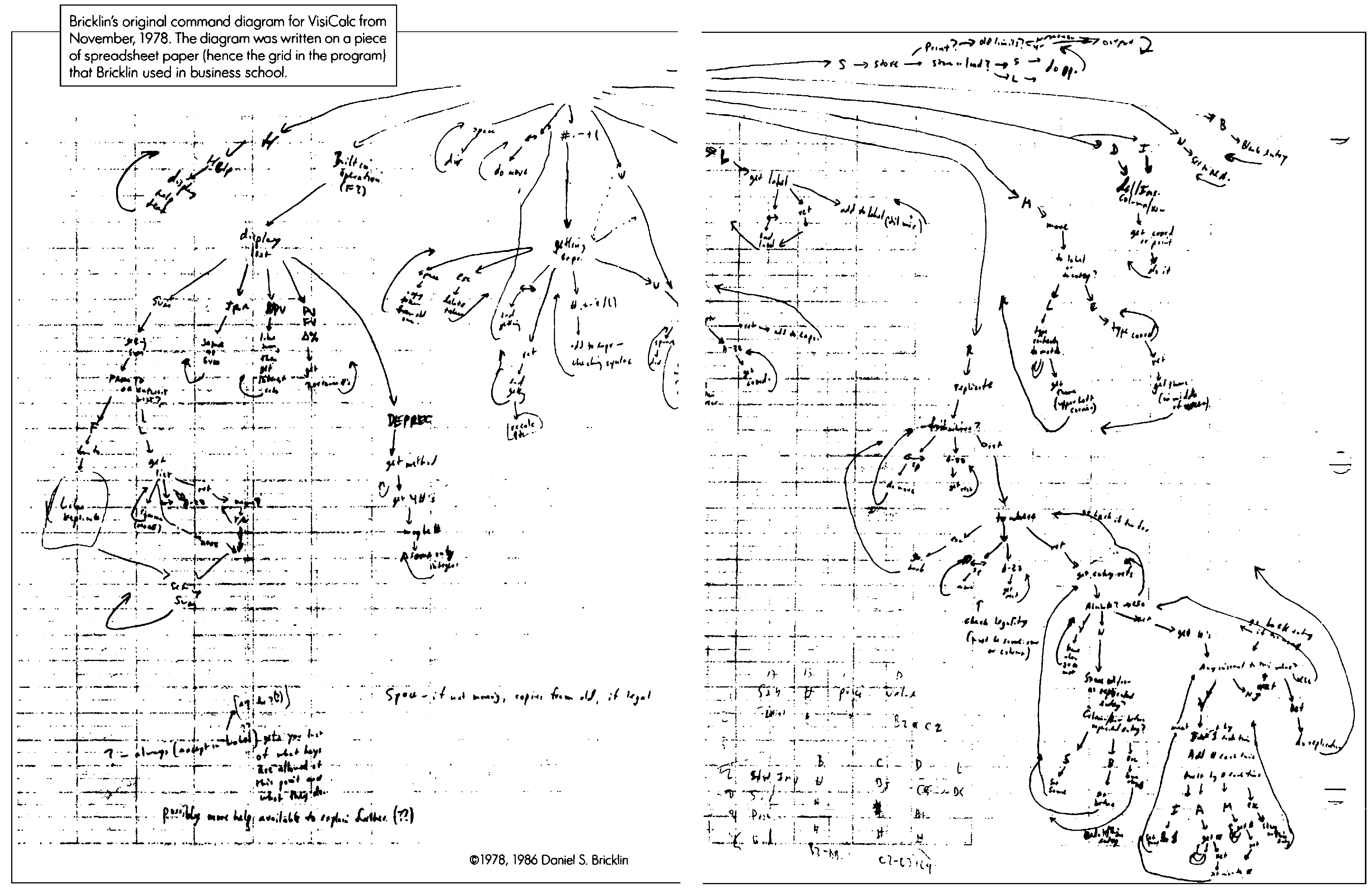 Bricklin’s Original command diagram for VisiCalc from November, 1978. The diagram was written on a piece of spreadsheet paper (hence the grid in the program) that Bricklin used in business school.